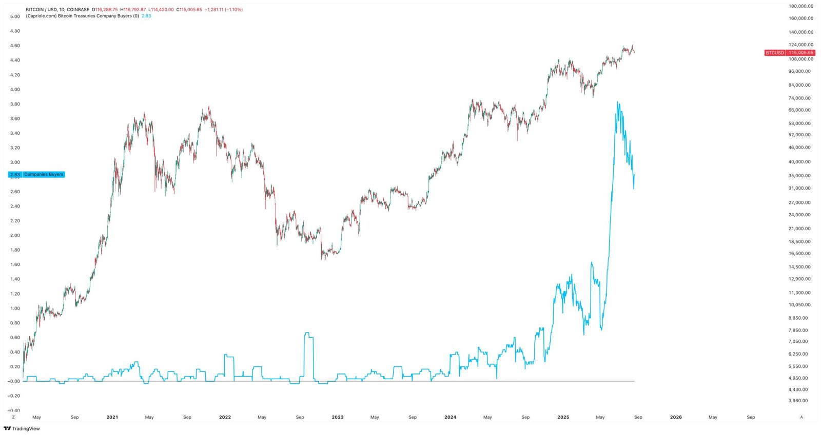 Despite Pioneer Crypto’s recent record-setting price performance, the number of companies buying Bitcoin for the Treasury has dropped to just 2.8 per day.
